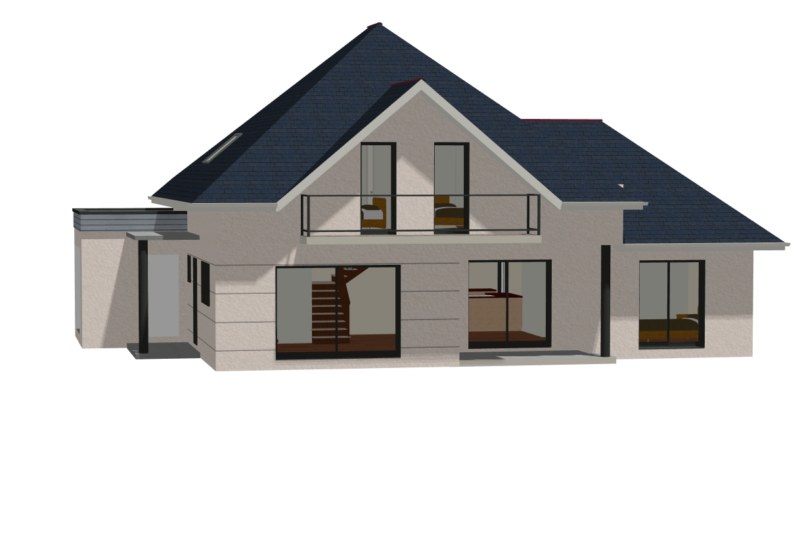 Projet de maison individuelle avec toiture en croupe, lucarne de nombreuses ouvertures au Sud ainsi qu'à l'Ouest. Ce projet se compose de 3 chambres et de 2 salles de bains dont une privative.